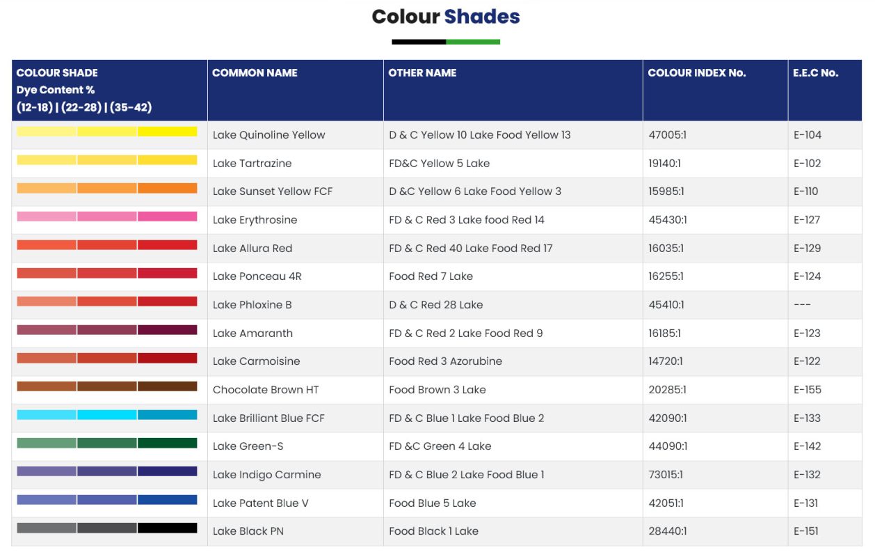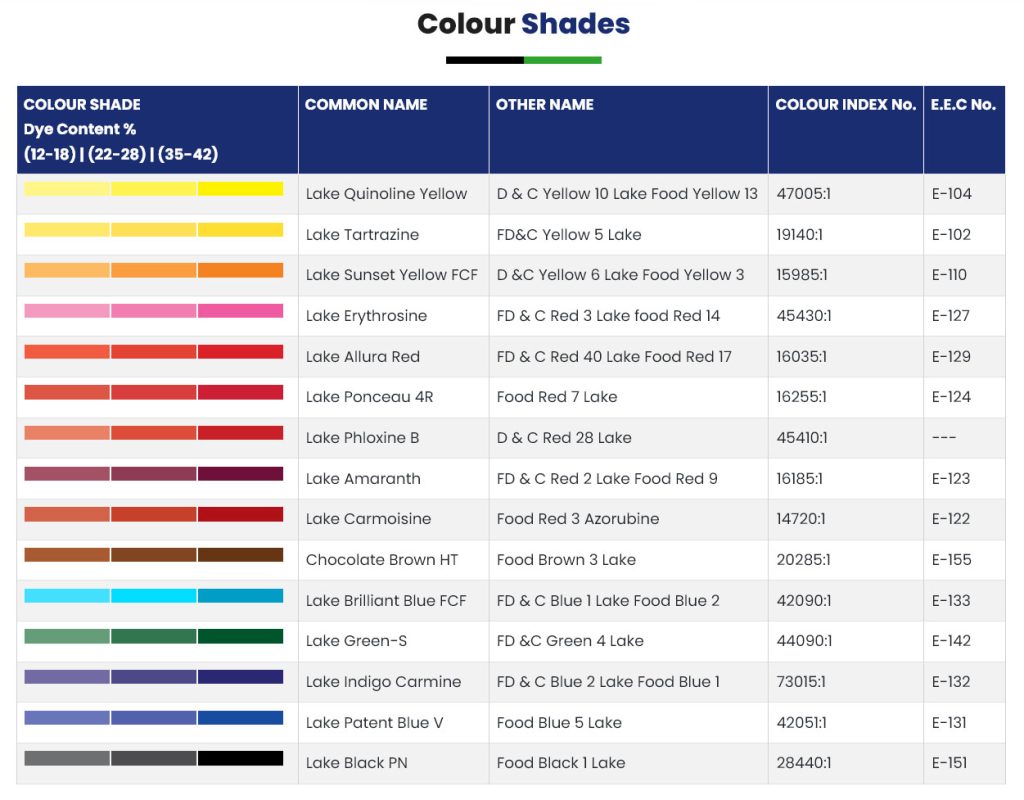 Lake colors are stable and do not bleed easily since they are dispersible in oil and fats. Lakes are produced in different concentration i.e. Low, Medium and High dye content. It is available in powder and liquid forms.
